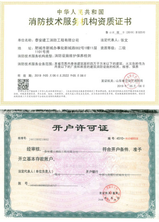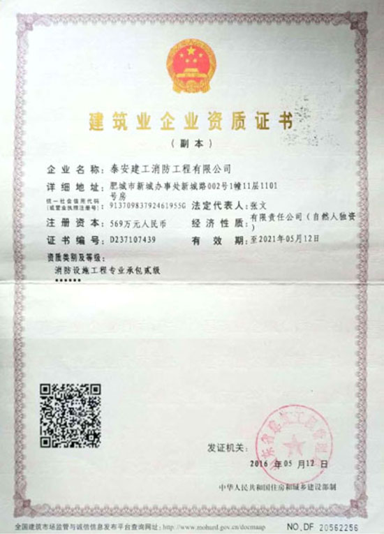 泰安建工消防工程有限公司,注冊成立于 2006 年8 月,注冊資金569 萬元。具有山東省公安廳消防局、山東省建筑工程管理局頒發的建筑消防設施貳級施工資質,2012 年9 月13日取得特種設備安裝改造許可證(電梯),2019 年5月取得建筑消防設施維修保養二級資質。是山東消防協會會員單位,2007 年6月被泰安市工商局命名為市級守合同重信用企業。 公司成立以來,一直奉行“質量第一,用戶至上,社會利益為先”的原則。公司在“重工程質量,創精品工程”的戰略方針指導下,已完成及目前在建的消防工程近百余項。公司下設工程部、技術部、維修部、財務部,工程技術專業人員 42 人。擁有一級、二級注冊建造師6 人,公司經理、技術負責人、財務負責人均具有高級專業職稱,所有技術人員均經省消防局或省建管局專業培訓并持證上崗。主要從事建筑消防設施施工、維護、保養、檢測;乘客電梯、載貨電梯、雜物電梯、自動扶梯、安裝、維修;消防器材、機電產品、礦山機械配件、電梯銷售;消防技術咨詢服務。